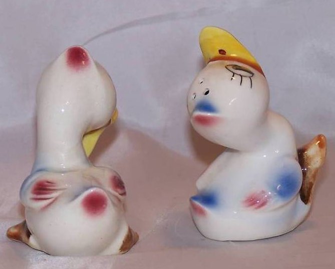 Colorful Duck Salt and Pepper Shakers **Duck with head thrown back is 3 1/2 inches tall, the other duck is 3 1/4 inches tall** **No breaks, no cracks, no repairs, no crazing** **Cork stoppers** 270649109079