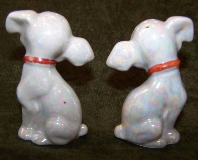 White Iridescent Dog Salt and Pepper Shakers 3 inches tall No cracks, no breaks, no repairs, no crazing Stamped "Made in Japan" in red ...