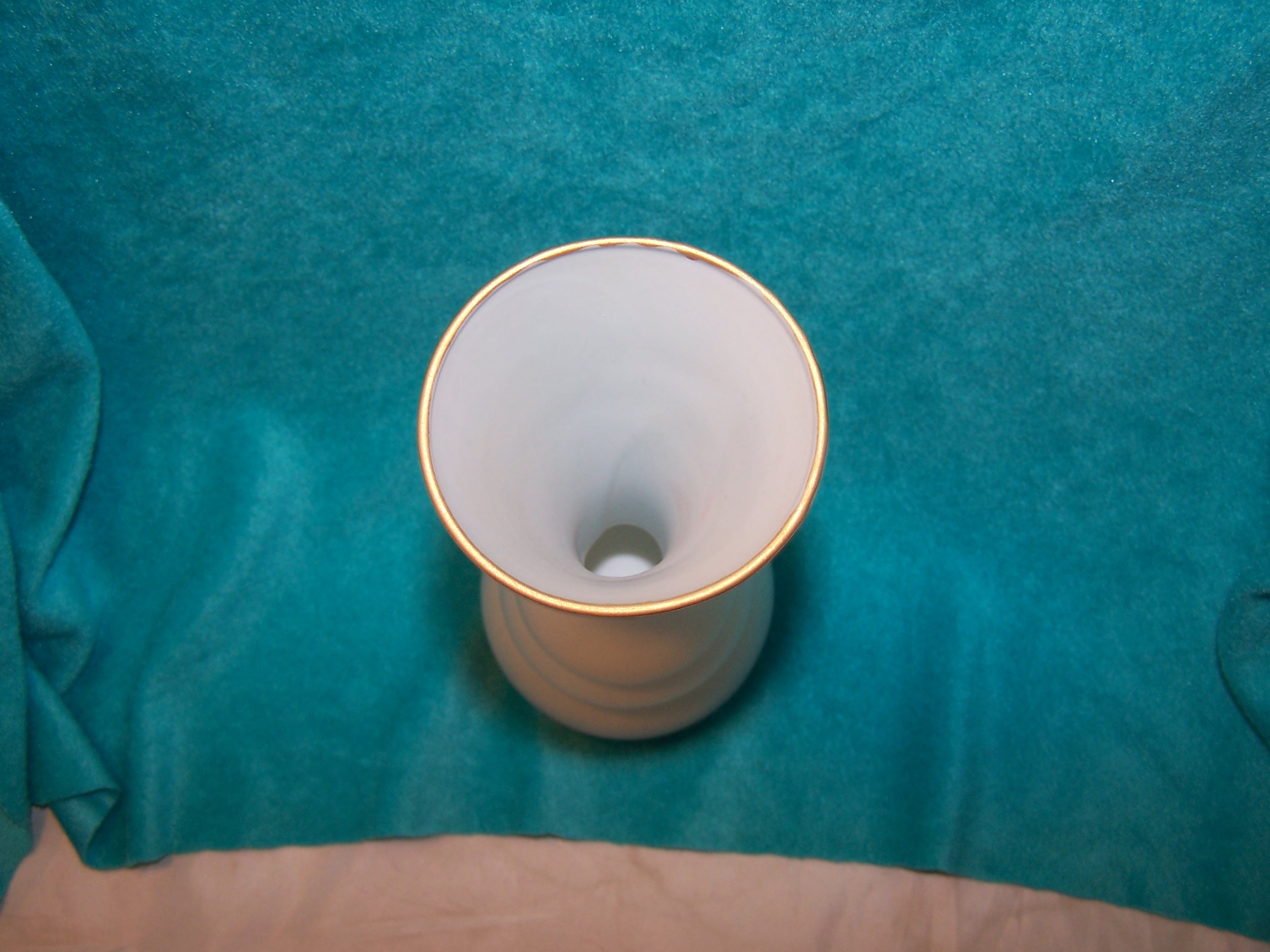 **Hand-painted gold rim. Vase features a butterfly poised in mid-flight above a red flower**
