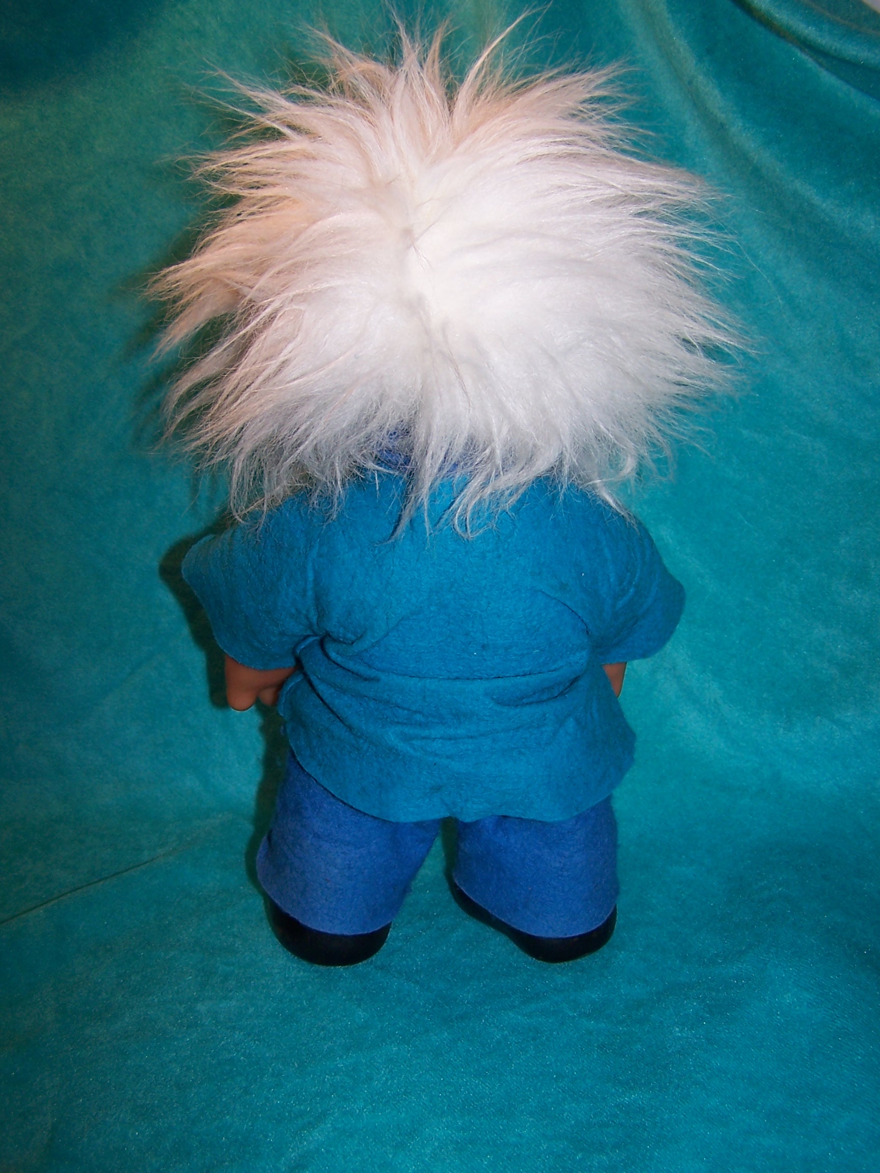 **Dressed in a blue felt shirt that has one fastening snap in the front, a pair of felt pants that are a darker shade of blue and also fasten in front with one snap. Topping off Grandpa's outfit is a fringed felt scarf around his neck that matches his pants**