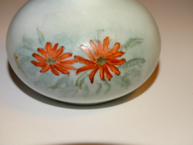 **Light blue porcelain perfume bottle embellished with delicate orange asters and whispers of leaves**