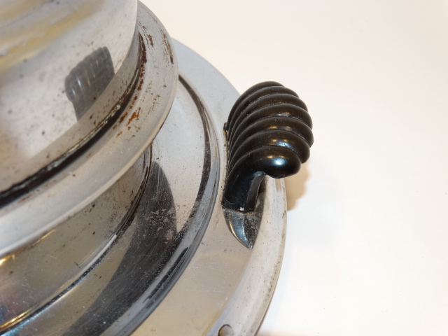 **Waffle iron is mounted on footed plate base, Bakelite handles, Art Deco style. Has indicator window on lid**